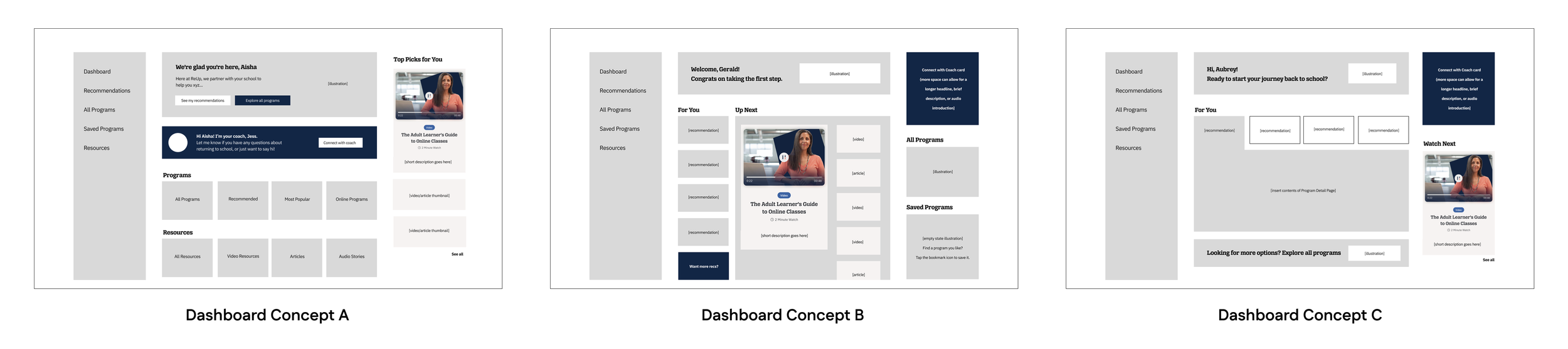 The alpha version of the Learner App included a landing page, onboarding questions, a “vision letter” and a basic dashboard. (image right)