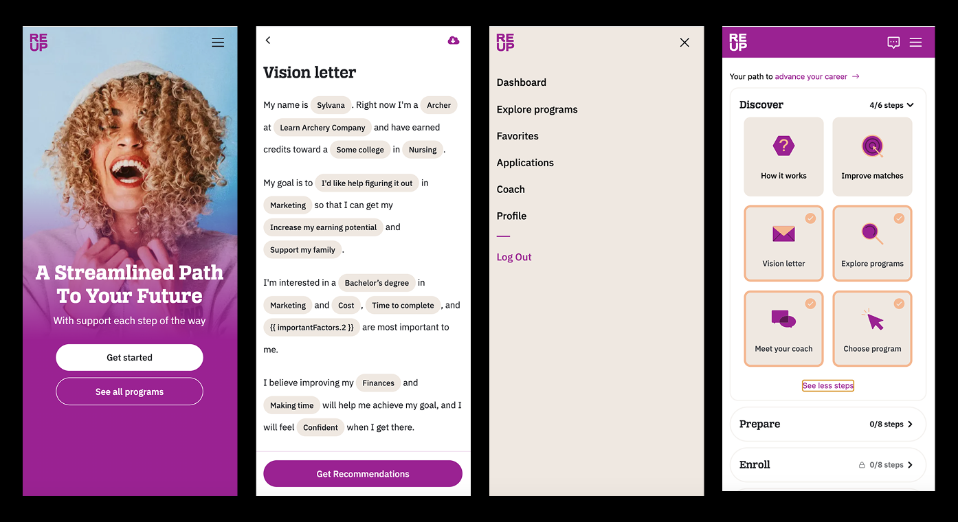 Two years later, the ReUp Learner App is generating $2 million in annual recurring revenue (ARR) across multiple partnerships and reducing operational overhead by $450K annually. It helps prospective students compare programs they’re interested in, offers personalized recommendations, and provides interactive resources to help them overcome common barriers to re-enrollment.